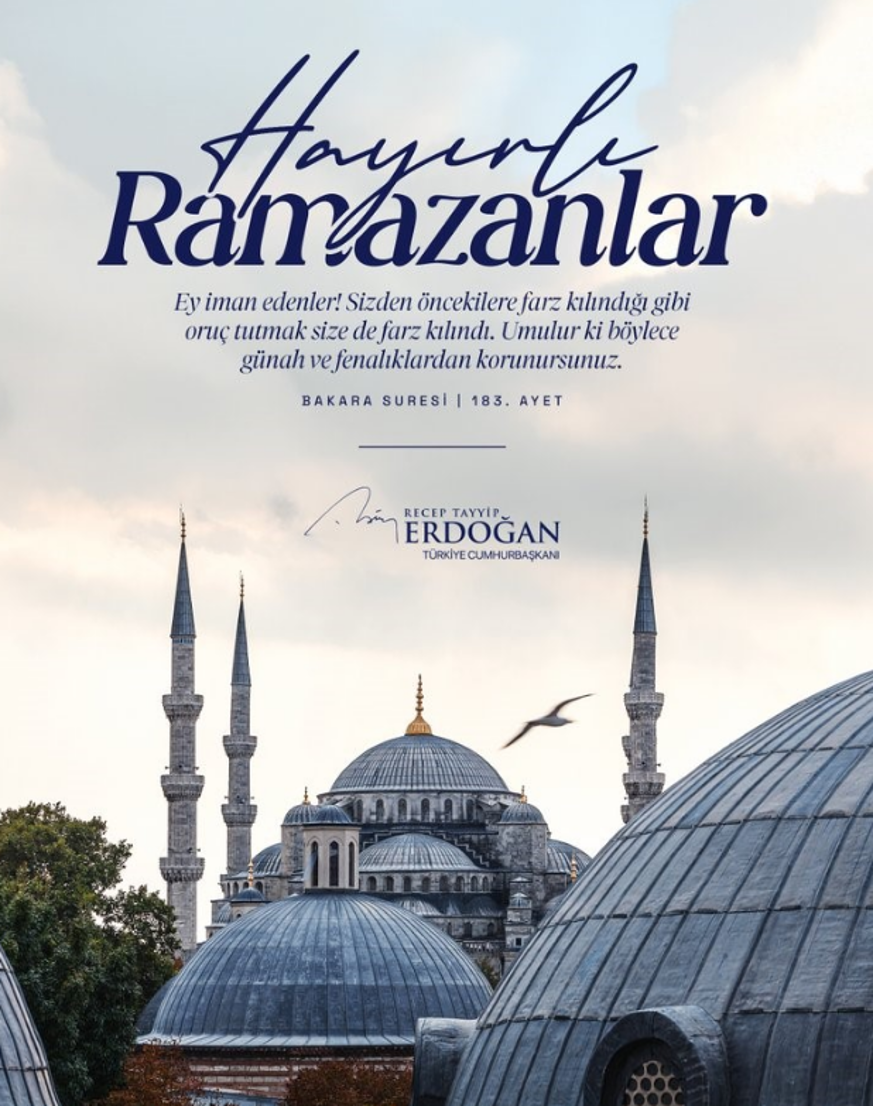 Cumhurbaşkanı Erdoğan, sosyal medya hesabından yaptığı açıklamada, Bakara Suresi'nin 183'üncü ayetini paylaşarak Ramazan ayını tebrik etti. Cumhurbaşkanı Erdoğan, "Ramazan-ı Şerif’in milletimiz, İslam alemi ve tüm insanlık için hayırlar getirmesini diliyorum. Rahmet kapılarının açıldığı bu mübarek günlerin birlik ve beraberliğimizi güçlendirmesini Rabb’imden niyaz ediyorum. Hayırlı Ramazanlar" dedi.