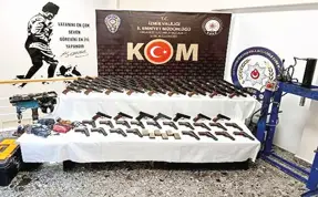 İzmir'de, yasa dışı silah imalatı ve ticareti yapıldığı gerekçesiyle belirlenen adreslere polis tarafından yapılan baskında 100'ün üzerinde tabanca ve malzeme ele geçirildi, 4 kişi gözaltına alındı.