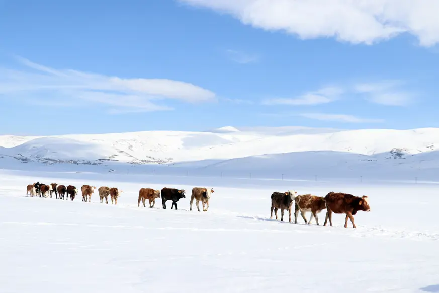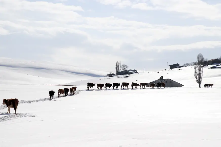 Beyaz örtüyle kaplı arazilerden geçirip derelerde su ihtiyacını karşıladıkları hayvanlarını, kar üzerinde besleyen yöre sakinleri için iklimin zorlukları mart ayında da kendini gösteriyor.