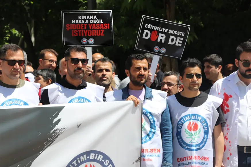 Grup adına açıklamayı okuyan Eğitim-Bir-Sen Başkanı İbrahim Bahşi, eğitim çalışanlarına yönelik artan şiddet olaylarını protesto etmek için toplandıklarını söyledi.