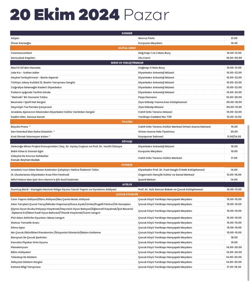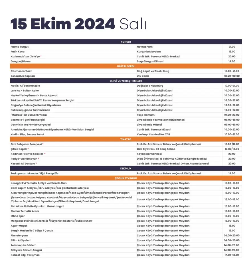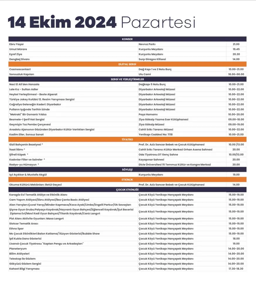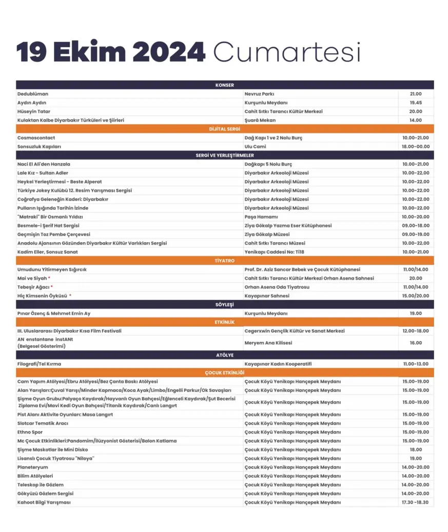 Diyarbakır, 12-20 Ekim 2024 tarihleri arasında Kültür ve Turizm Bakanlığı tarafından düzenlenen Kültür Yolu Festivali'ne ev sahipliği yapmaya hazırlanıyor. Şehrin zenginliklerinin öne çıkarılacağı festivalde, Diyarakır'ın kültürel mirası, müzik, sanat ve gastronomik özellikleri görücüye çıkacak. Diyarbakır’ın tarihi surları ve Hevsel Bahçeleri gibi UNESCO Dünya Mirası listesinde yer alan noktalar festival boyunca açık hava konserleri, tiyatro gösterileri, dans performansları ve sanat sergilerinin yer alacağı noktalar olacak.