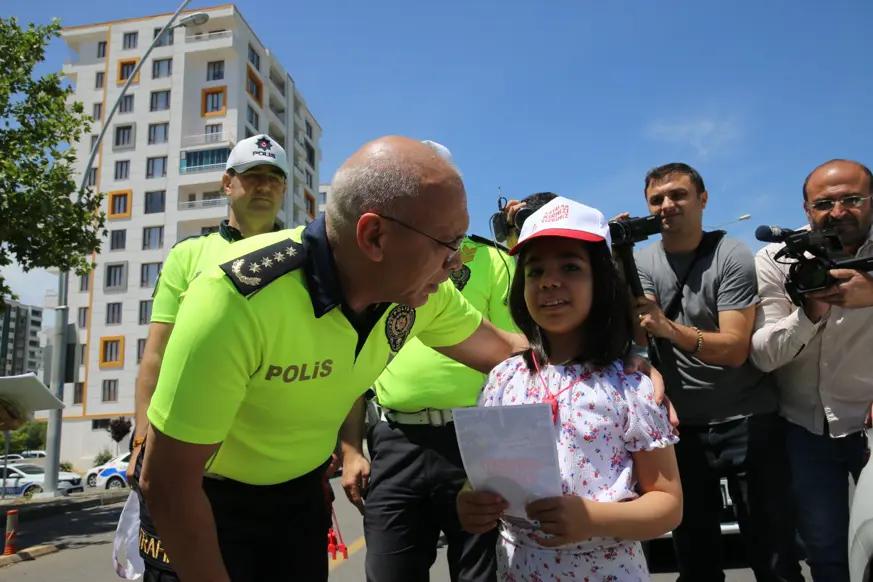 Diyarbakır'da merkez Kayapınar ilçesi Fırat Bulvarında düzenlenen etkinliğe katılan İl Emniyet Müdürü Fatih Kaya, sürücüleri trafik kurallarına uyması konusunda uyardı, araçlardaki çocuklara şapka, düdük ve oyuncak hediye etti.