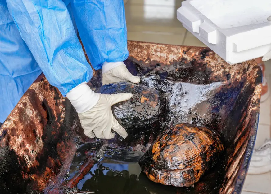 Ekiplerce, Dicle Yaban Hayvanı Kurtarma ve Rehabilitasyon Merkezi'ne getirilen kaplumbağaların üzerindeki zift, DKMP Diyarbakır Şube Müdürlüğünde yaban hayvanları üzerine çalışma yürüten veteriner hekim Kasım Ertürk ve Emre Yalçın tarafından temizlendi.