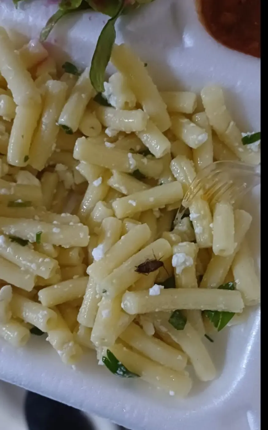 Peki mevzu ne derseniz?.. Resimde görüldüğü gibi.. Pür dikkat bakın.. Biliyorum mideniz bulanacak, ama mevzu önemli.. Poliklinik çalışanlarına öğlen dağıtılan yemekte yer alan peynirli makarnanın içerisinde, yabancı bir cisim tespit edilmiş.. Bu cisim de görüldüğü gibi ölü bir hamam böceği..