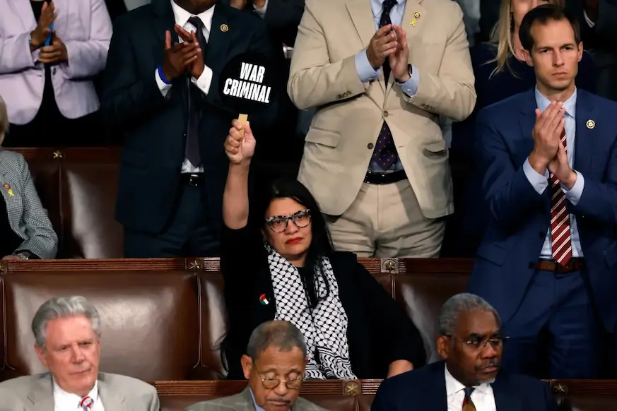 ABD’nin caniliğe onay veren, Kongre üyelerinin içinde, tek bir ses yükseldi; buna alkış tutamam dedi.. O da. Rashida Tlaib.. Koca yürekli bir kadın.. Netanyahu’nun konuşma süresi içerisinde, yerin de oturdu, Filistin atkısı boynunda..? Her alkışta, kendine özgü protestoda bulundu?!..